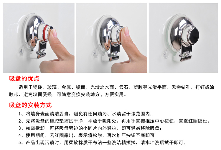 本產品屬于吸盤系列,吸盤吸力大,經久耐用,不易脫落。